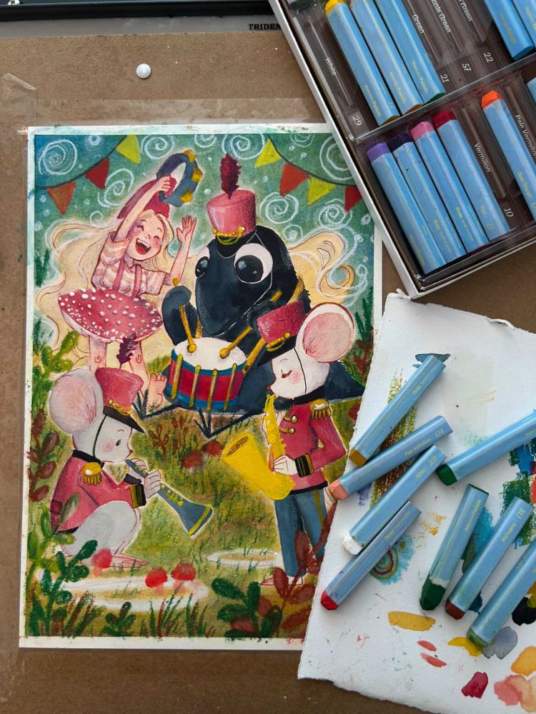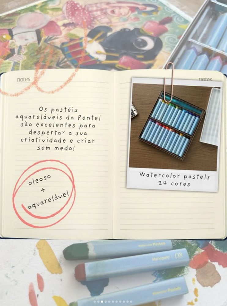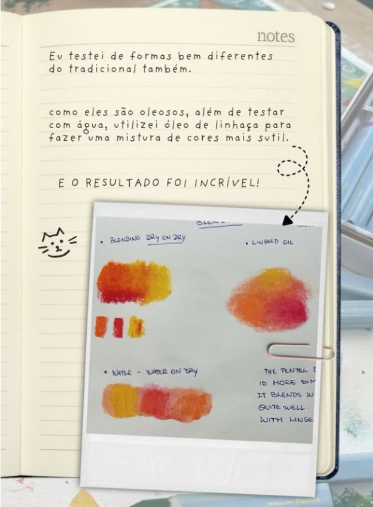 O giz pastel oleoso aquarelável da Pentel é um material que realmente impressiona pela praticidade e beleza que entrega. O que mais chama a atenção é a versatilidade: você tem a intensidade e a textura rica do pastel oleoso tradicional, mas com a possibilidade de transformar tudo em uma pintura fluida apenas usando um pincel com água.