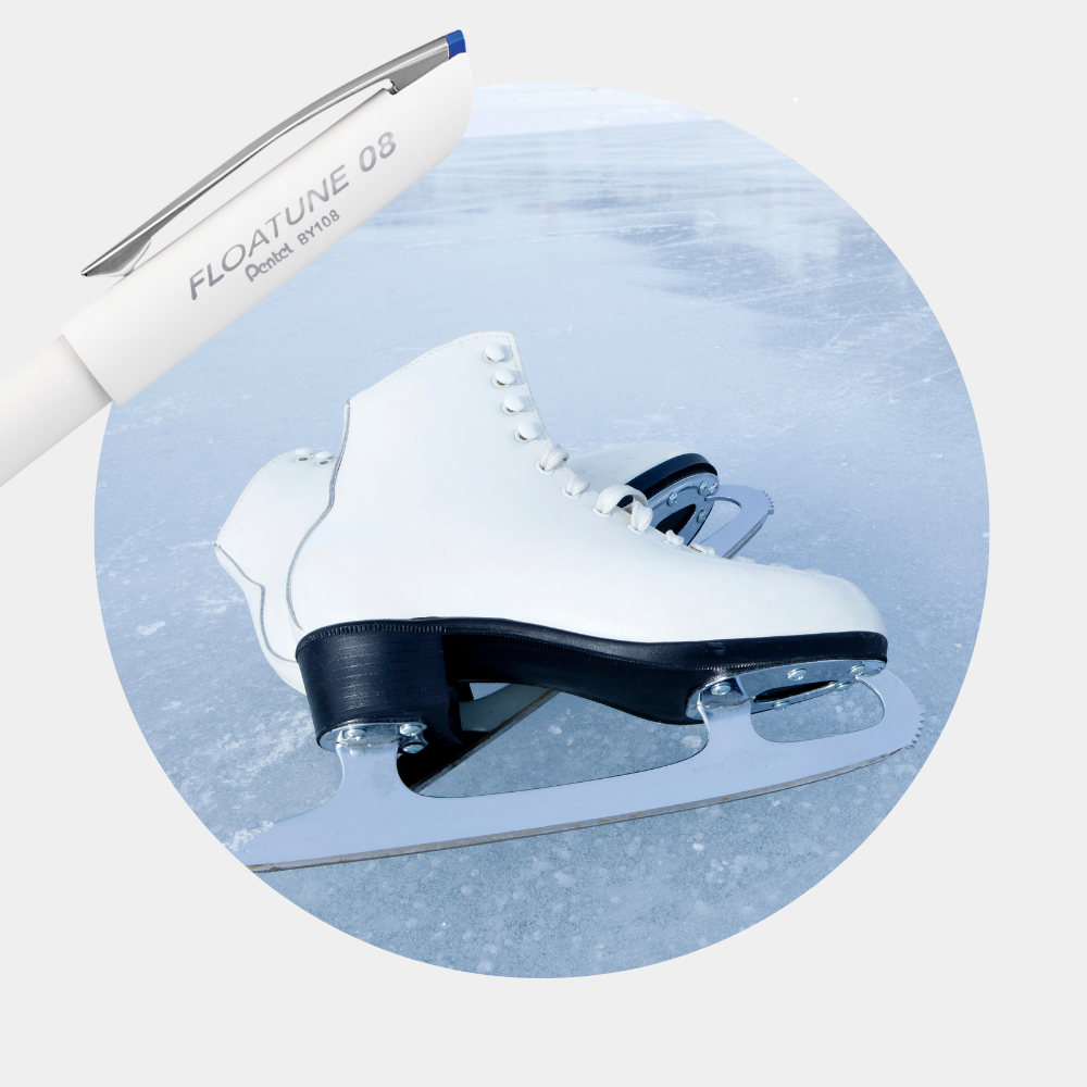 Formato único da tampa da caneta que lembra uma lâmina de patins.